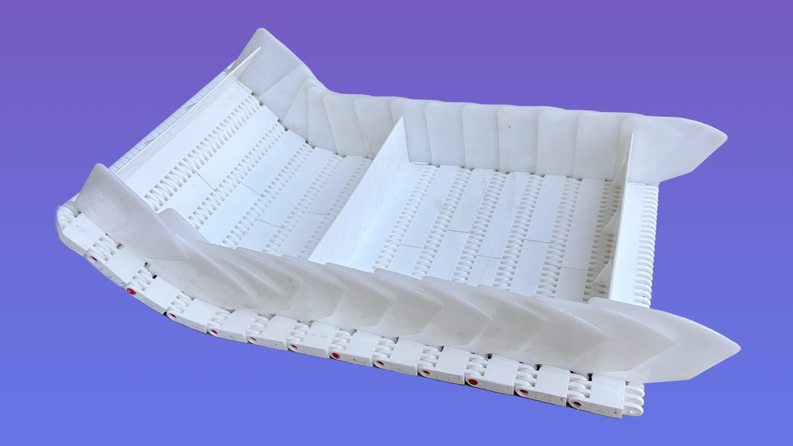 Banda Modular Modelo XT3500 con paletas está conformado por Módulos con paletas empujadoras poseen un nervio en el eje central del mismo, cuya función es elevar  el  producto en  transportadores con pendientes positivas o negativas, actuando de forma tal de “empujar” al producto en la dirección de sentido de avance del transportador.